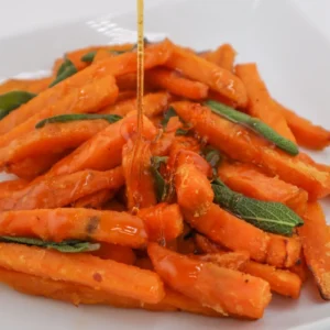 Crispy sweet potato fries with fresh sage and a hot honey drizzle—a perfect balance of sweet, spicy, and herby flavors that will elevate any meal or snack time.